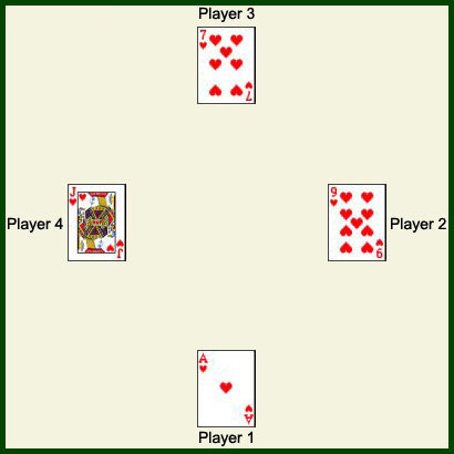 | Player 1 Leads Off with the Ace of Hearts (not Trumps) Player 2 is next, Player 2 has a heart in their hand and plays the Nine of Hearts (worth 0 points) Player 3 is next, Player 3 has a heart in their hand and plays the Seven of Hearts Player 4 is next, Player 4 has a heart in their hand and plays the Jack of Hearts (worth 2 points) Players 2 and 4 would play their least valuable Hearts to avoid putting points into the Lift belonging to Players 1 and 3. This Lift belongs to Player 1 because Player 1 had the highest Heart. Player 1 will Lead Off the next Lift. |