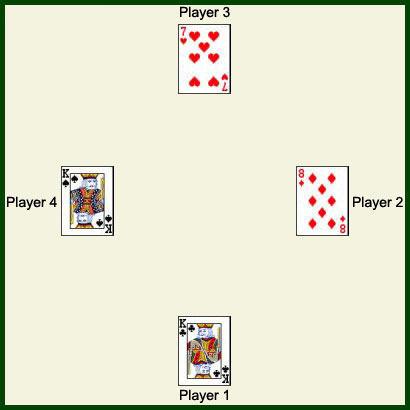 King of Clubs (not Trumps). Player 2 does not have a Club and Trumps the Lift with the 8 of Diamonds (Trumps in this Round). Player 3 does not have a Club or Diamond (Trumps); Player 3 plays a low point card from their hand, 7 of Hearts (0 points). Player 4 does not have a Club either but since the Lift is Trumped by Player 2, Player 4 does not need to Trump also. Player 4 can play any other suit. Player 4 plays a King of Spades. This Lift belongs to Player 2 because Player 2 Trumped the Lift and no one else could Go Over (in Trumps). Player 2 will Lead Off the next Lift. |